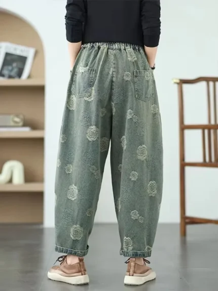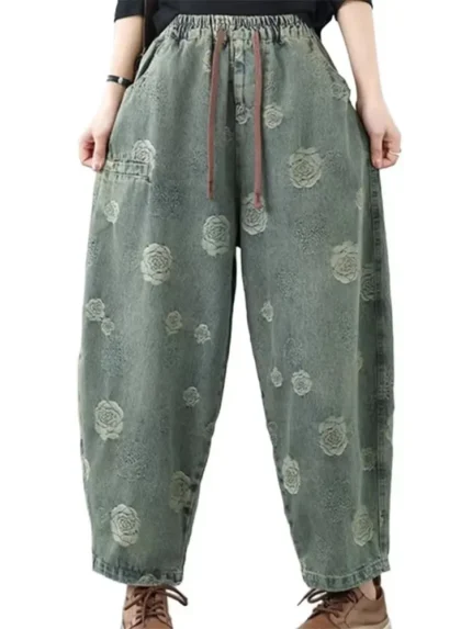2025 Korean Summer Fashion Ladies Floral Denim Pantalons Loose Vintage Jeans Women Classic Casual Elastic Waist Harem Trousers