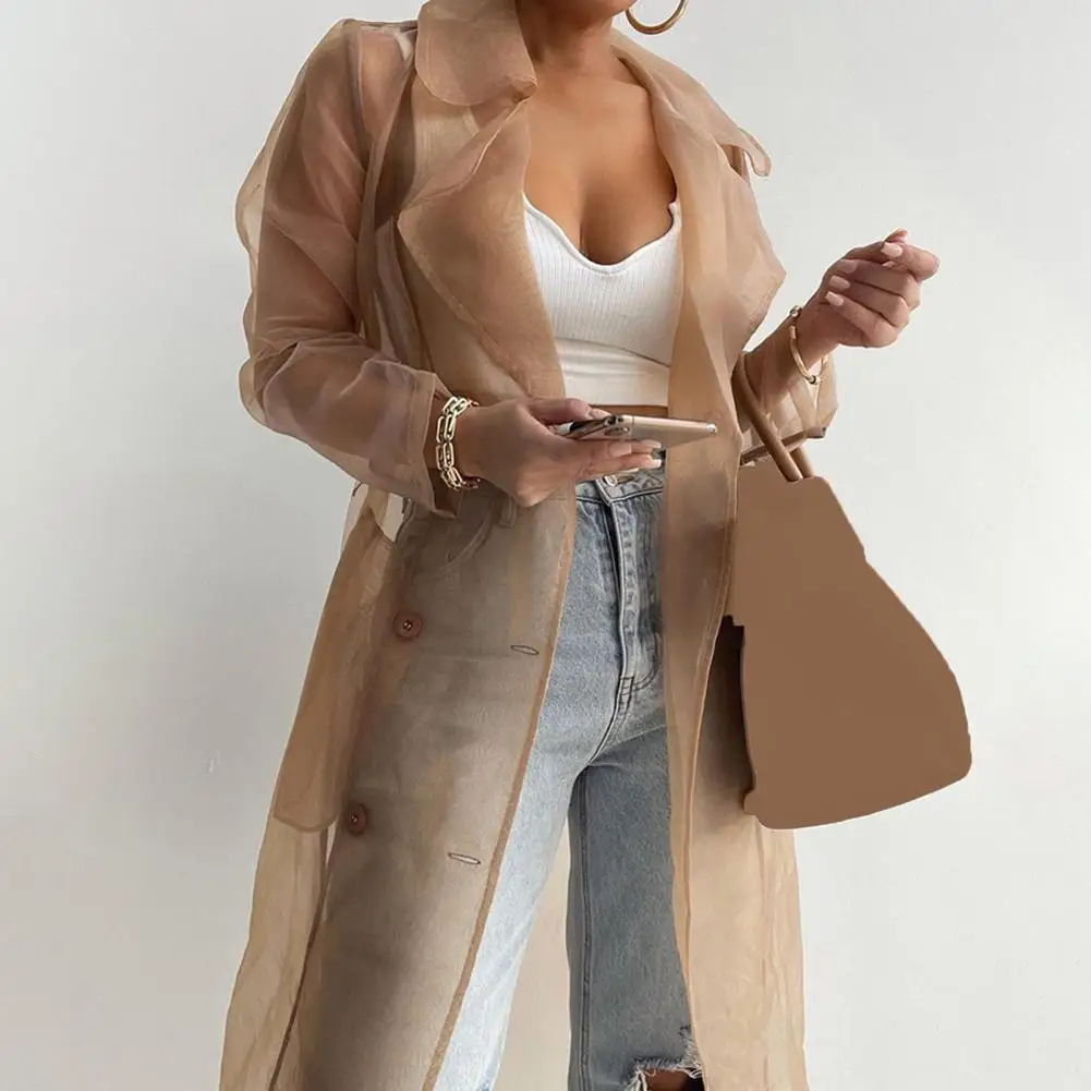 Spring Summer Women Coat Solid Color Turndown Collar Long Sleeve Net YarnWomen Shirt See Through Lace-up Female Long Shirt