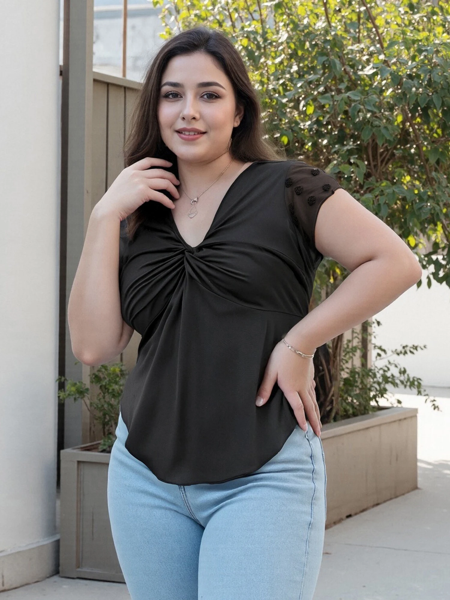 Home 👗 Women’s Fashion Tops & Tees Women s Plus Size Summer Tops Twist Front V Neck Curved Hem Patchwork Mesh Short Sleeve Blouses with Floral Print